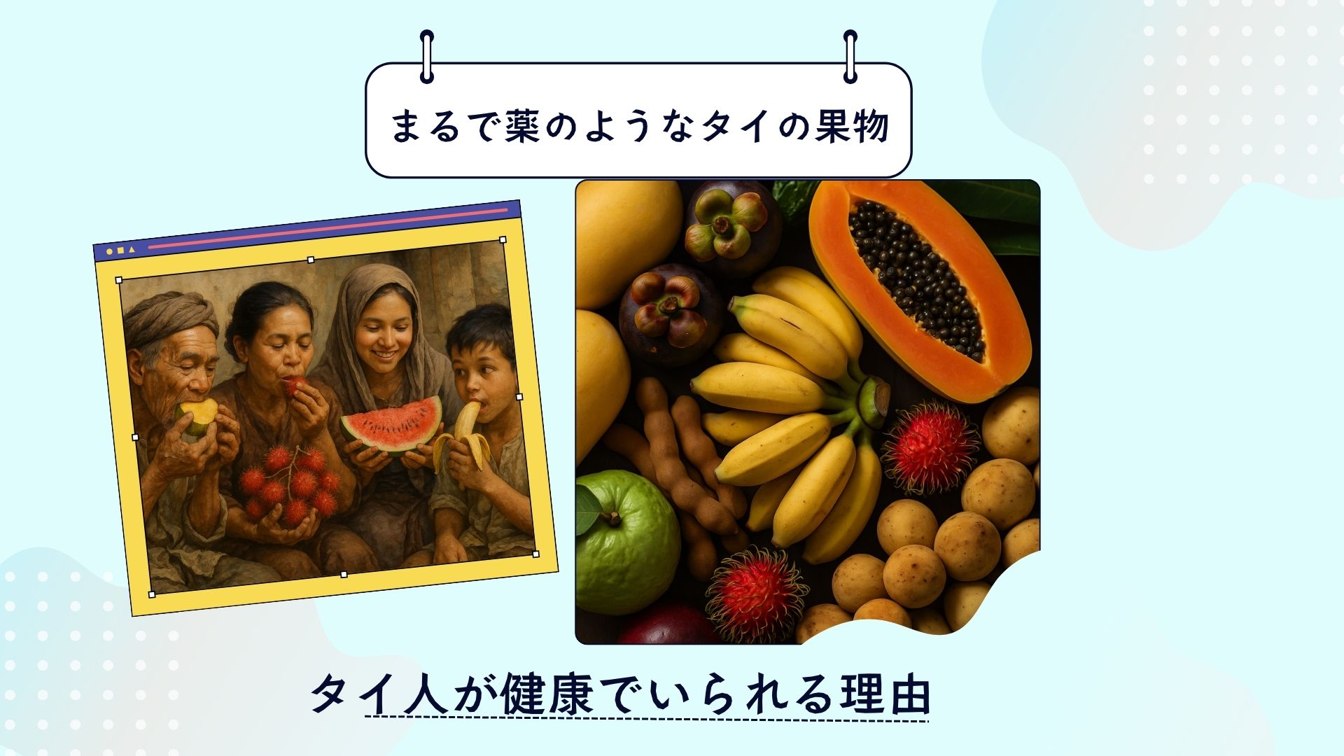 タイといえば美しい自然、笑顔、スパイスの効いた料理、そして多彩な果物で知られています。中でも、タイで昔から親しまれてきた果物には、ただ美味しいだけでなく「薬のように身体に良い効果がある」と信じられているものが数多く存在します。本記事では、タイ人の生活に深く根付いた果物の種類や、それぞれが持つ健康効果について紹介しながら、「なぜタイの人々が自然と健康を維持できるのか」を解き明かしていきます。
